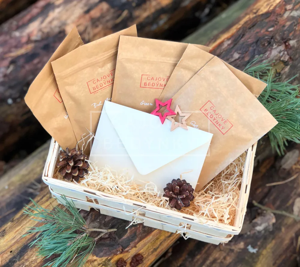 Výběr 5 fajnových sypaných čajů v nazdobené dárkové bedýnce. Obsah je překvapením.
