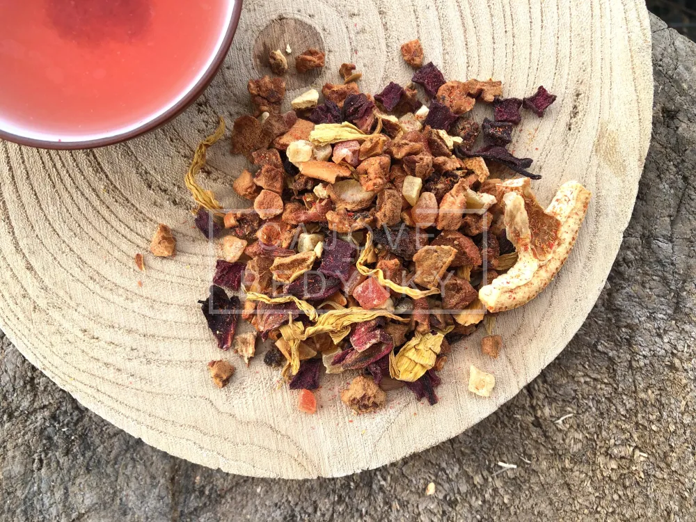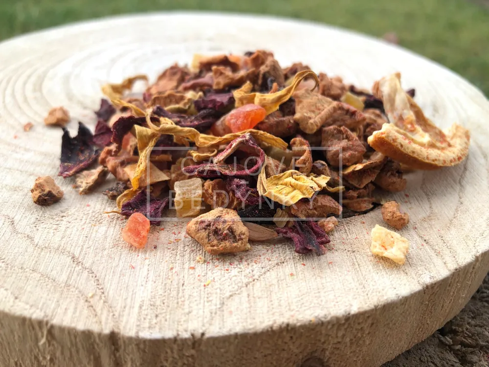 - Vzorky - Chceš vyzkoušet tento ovocný čaj? Za každých 400,- Kč v objednávce máš nárok na jeden (10 g). Do této hodnoty se započítávají pouze sypané čaje(tedy NIKOLI doprava, předplatné Čajových Bedýnek, dárkové či degustační balíčky, čajové kurzy či jiné „nefyzické“ produkty, naše výběrová káva). Svůj výběr vzorku / vzorků napiš do objednávkového formuláře do příslušné kolonky.