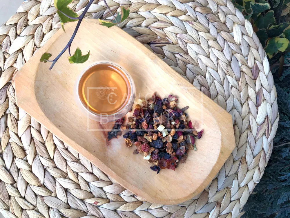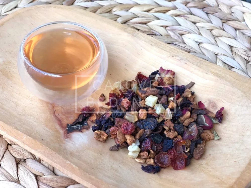 - jablko, rozinky, šípek, ibišek, slazený ananas, skořice, růže, citrón, červený rybíz, hřebíček, kardamom, aroma